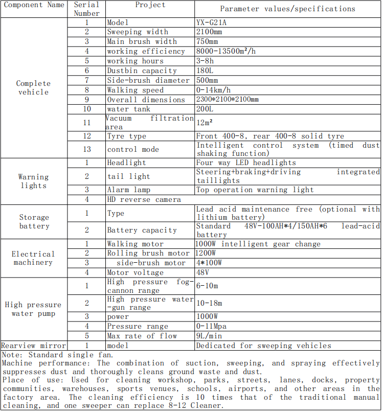 ব্যবহারের স্থান: ওয়ার্কশপ, পার্ক, রাস্তাগুলি, লেনস, ডকস, প্রপার্টি কমিউনিটিস, গুদাম, ক্রীড়া স্থান, স্কুল, বিমানবন্দর এবং থ্যাক্টরি অঞ্চলের অন্যান্য অঞ্চল পরিষ্কারের জন্য ব্যবহৃত। পরিষ্কারের দক্ষতা traditional তিহ্যবাহী ম্যানুয়াল ক্লিয়ানিংয়ের চেয়ে 10 গুণ এবং একটি সুইপার 8-12 ক্লিনার প্রতিস্থাপন করতে পারে